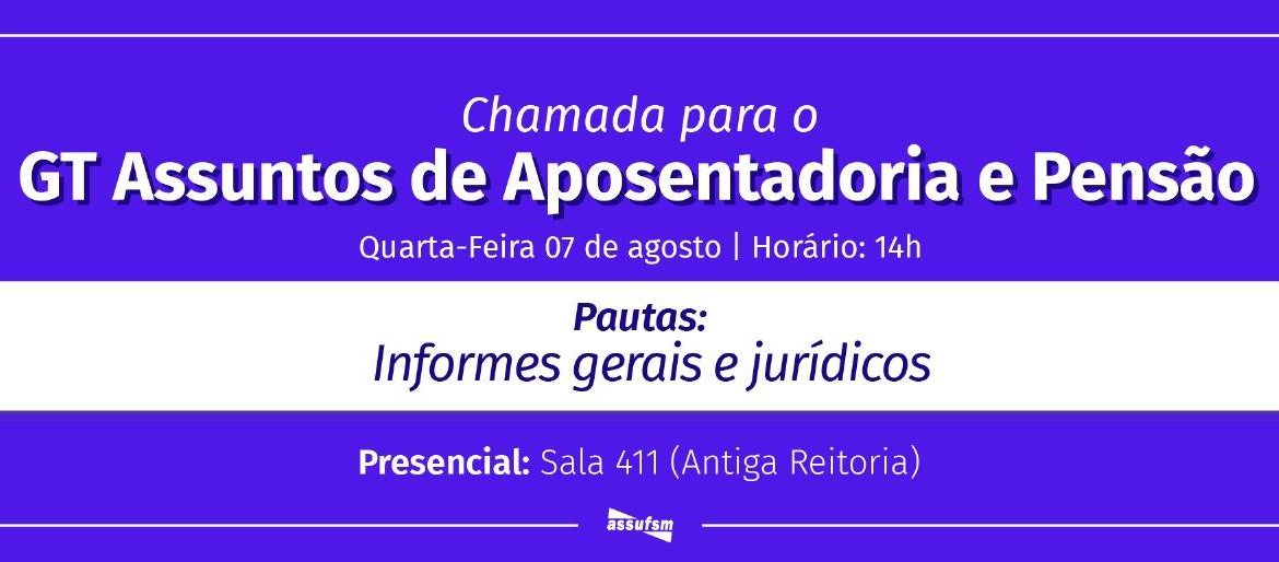 Atenção, aposentado(a) e pensionista: o GT Assuntos de Aposentadoria e Pensão da Asssufsm se reúne na tarde da primeira quarta-feira de agosto (07).
