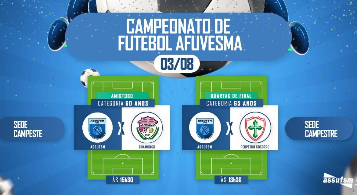 No próximo sábado, dia 3 de agosto, acontece uma rodada de amistosos para a categoria dos 60 anos e mais uma rodada decisiva do campeonato da AFUVESMA para os 65 anos. Confira os jogos: