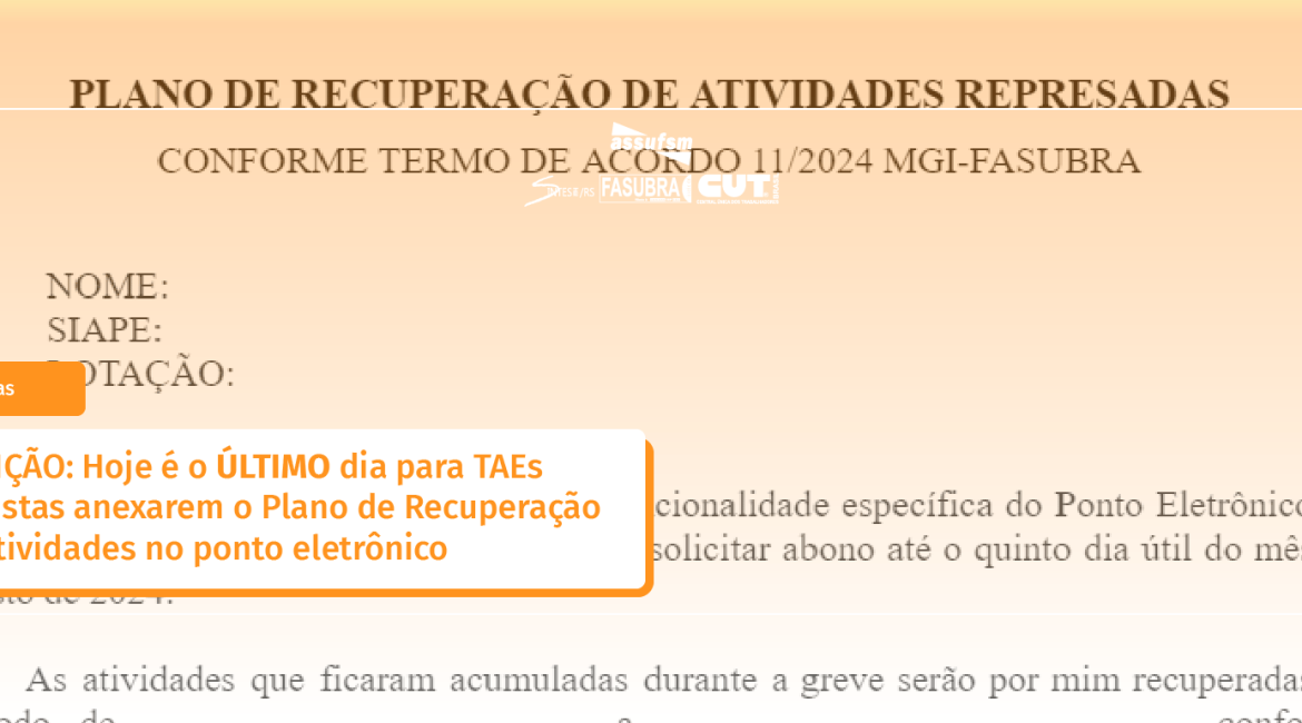 HOJE (07) é o último dia para anexar o Plano de Recuperação de Atividades de TAEs grevistas no Ponto Eletrônico na UFSM. Desde o dia 25 de julho, o espaço para colocação do Plano de Recuperação de Atividades Represadas na Greve de 2024 já consta no ponto eletrônico. Também foi lançado um tutorial pela PROGEP para que os (as) TAEs que tivesesm dúvidas conseguissem colocar os documentos corretamente no ponto. O prazo iniciou em 24 de julho e encerra HOJE, 07 de agosto.