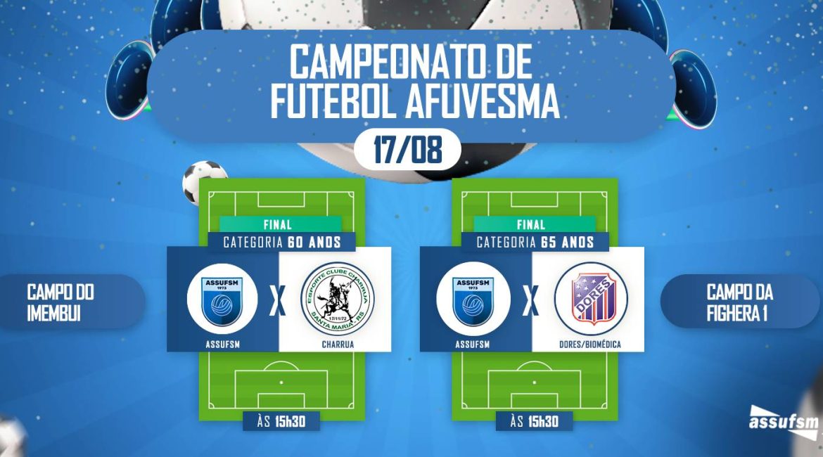 No próximo sábado, dia 17 de agosto, acontecem as grandes finais do campeonato de futebol AFUVESMA. Os jogos acontecem no mesmo horário, mas em campos diferentes.