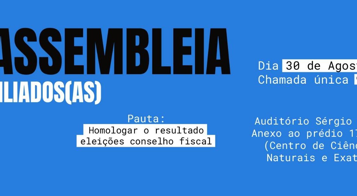 No dia 30 de agosto, às 9h, a Assufsm está chamando Assembleia de Filiados e Filiadas, com pauta única para homologação do resultado das eleições para o Conselho Fiscal da Assufsm 2024/2026. O local da Assembleia é o Auditório Sérgio Pires, Anexo ao prédio 17 CCNE (Centro de Ciências Naturais e Exatas).