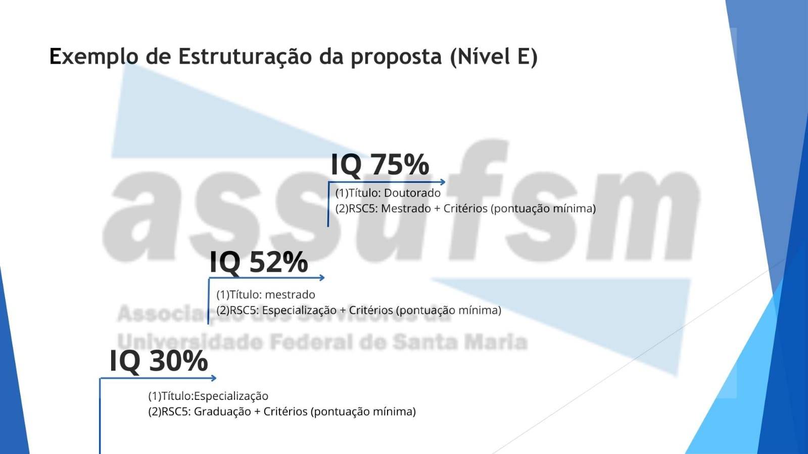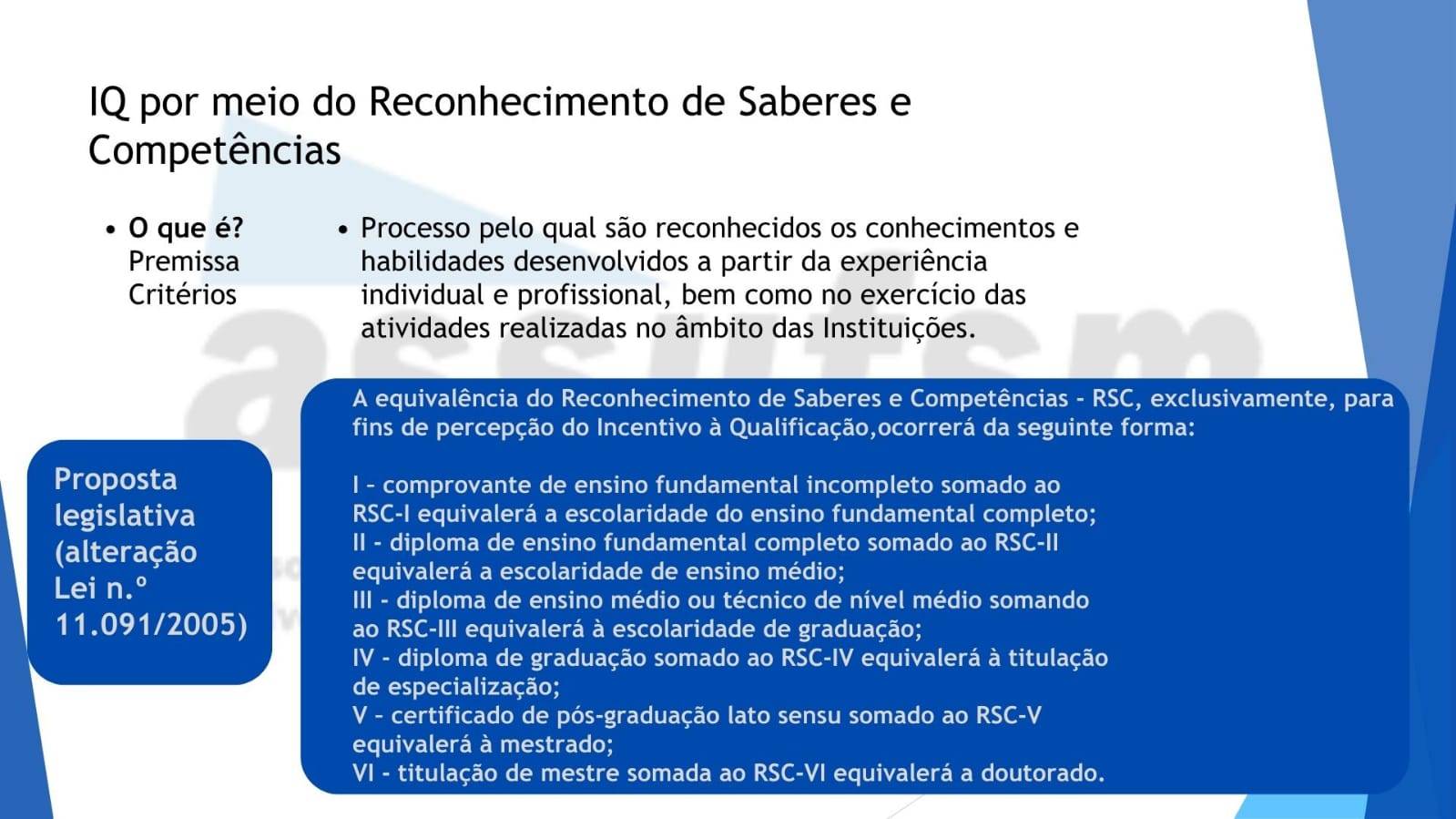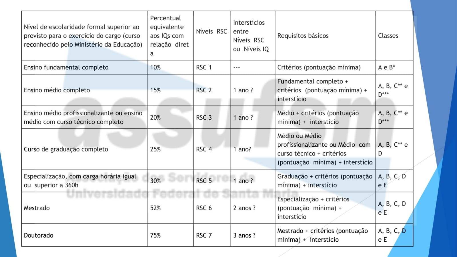 O IQ por meio do Reconhecimento de Saberes e Competências (RSC) é o processo pelo qual são reconhecidos os conhecimentos e habilidades desenvolvidos a partir da experiência individual e profissional, bem como no exercício das atividades realizadas no âmbito das instituições. Essa equivalência do RSC, exclusivamente, para fins de percepção do Incentivo à Qualificação (IQ), ocorrerá da seguinte forma: I – comprovante de ensino fundamental incompleto somado ao RSC – I equivalerá à escolaridade do ensino fundamental completo; II – diploma de ensino fundamental completo somado ao RSC – II equivalerá à escolaridade de ensino médio; III – diploma de ensino médio ou técnico de nível médio somando ao RSC -III equivalerá à escolaridade de graduaçãp; IV – diplima de graduação somado ao RSC-IV equivalerá à titulação de especialização; V – certificado de pós-graduação lato sensu somado ao RSC – V equivalerá a mestrado; VI – titulação de mestre somada ao RSC – VI equivalerá a doutorado. Se você tem dúvidas, sugestões de melhorias ou outros critérios, mande um email para comunica.assufsm@gmail.com ou ainda você pode participar respondendo o formulário disponível aqui até o dia 16 de setembro de 2024. Confira mais informações nas tabelas abaixo: