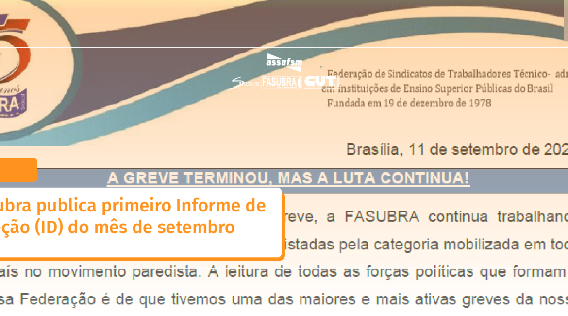 A Fasubra publicou, na quarta-feira (11 de setembro), o Informe de Direção n° 1 do mês de setembro. O documento traz informes sobre a luta e defesa da FASUBRA nos seus 45 anos de história, a FASUBRA nas eleições municipais, notícias sobre a participação da Federação em Audiências Públicas em defesa da categoria de TAEs, a Convocatória para Plenária Nacional da Fasubra e para o Seminário de Carreira junto de um anexo sobre a orientação para a discussão preparatória nas entidades de base e a orientação sobre cobrança de relatório de gestão da EBSERH.