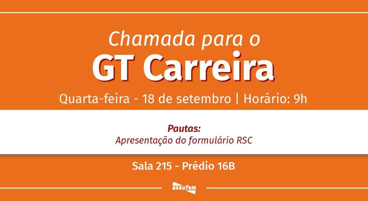 O GT Carreira se reúne na próxima quarta-feira, dia 18 de setembro, na Sala 215, no segundo andar do prédio 16B, no Centro de Educação, às 9h. Na pauta estão informes e a continuidade dos debates sobre o RSC.