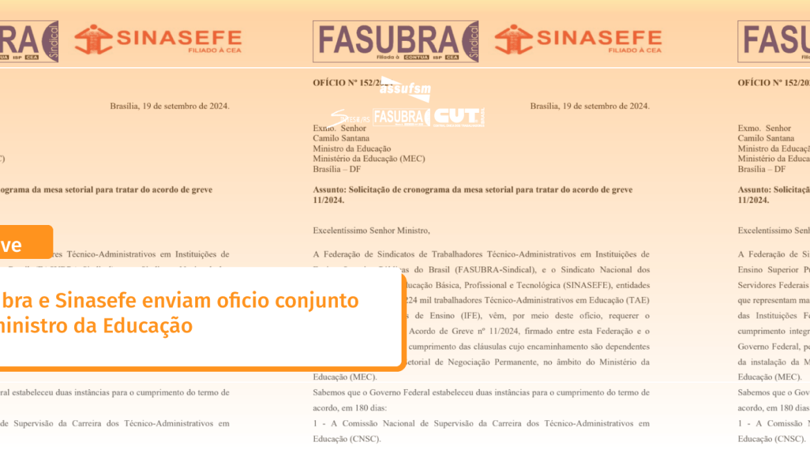 A Federação de Sindicatos de Trabalhadores Técnico-Administrativos (as) em Instituições de Ensino Superior Públicas do Brasil (FASUBRA-Sindical) e o Sindicato Nacional dos Servidores Federais da Educação Básica, Profissional e Tecnológica (SINASEFE), entidades que representam mais de 224 mil trabalhadores Técnico-Administrativos em Educação (TAE) das Instituições Federais de Ensino (IFE), protocolaram na tarde desta terça-feira (24) ofício conjunto ao ministro da |Educação, Camilo Santana, requerendo o cumprimento integral do Acordo de Greve n.º 11/2024, firmado entre as entidades e o Governo Federal.
