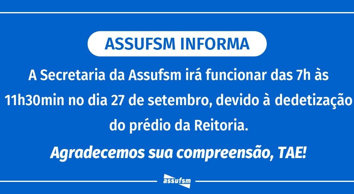 A Assufsm informa que na sexta-feira, dia 27 de setembro, a secretaria vai funcionar das 7h às 11h30min e estará fechada no período da tarde. O motivo é que o prédio onde se encontra, da Reitoria, será dedetizado.