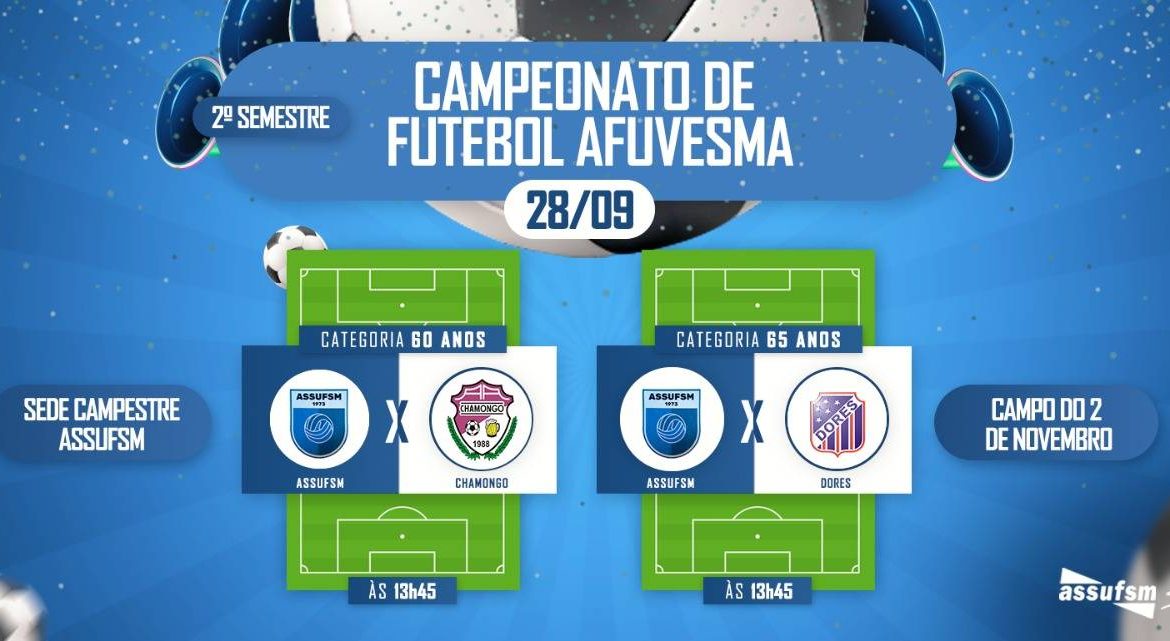 No próximo sábado, dia 28 de setembro, tem mais uma rodada do campeonato da AFUVESMA, para o segundo semestre de 2024, com a terceira rodada para as categorias dos 60 e 65 anos. Confira os jogos: