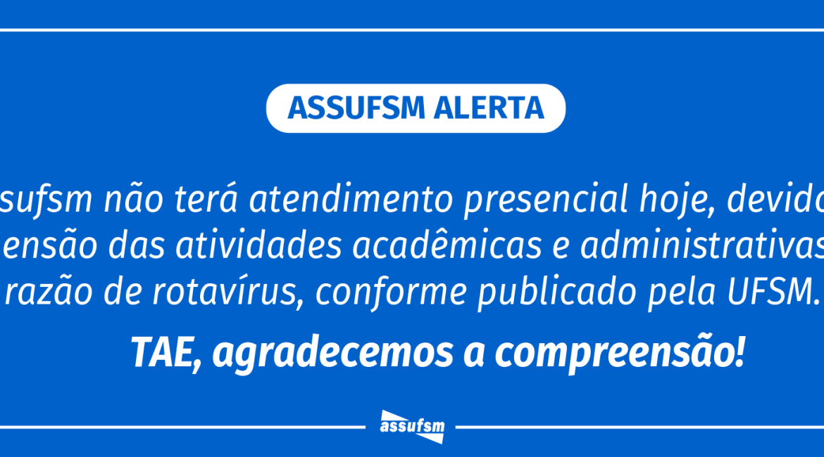 Devido ao surto de rotavírus e gastroenterite, a UFSM suspendeu suas atividades presenciais administrativas e acadêmicas. Dessa maneira, a Assufsm informa que também suspende suas atividades presenciais na data da hoje.
