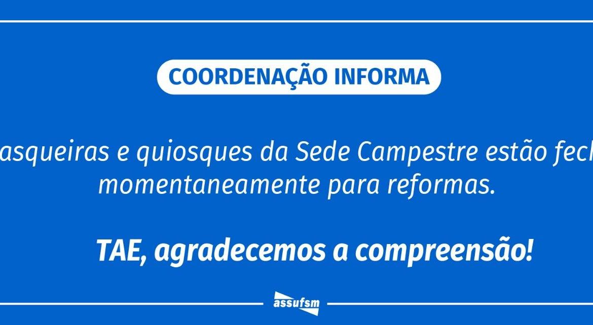Atenção TAE, filiado(a) à Assufsm, a Coordenação do Sindicato informa que as churrasqueiras e quiosques estão momentaneamente fechados para reformas.