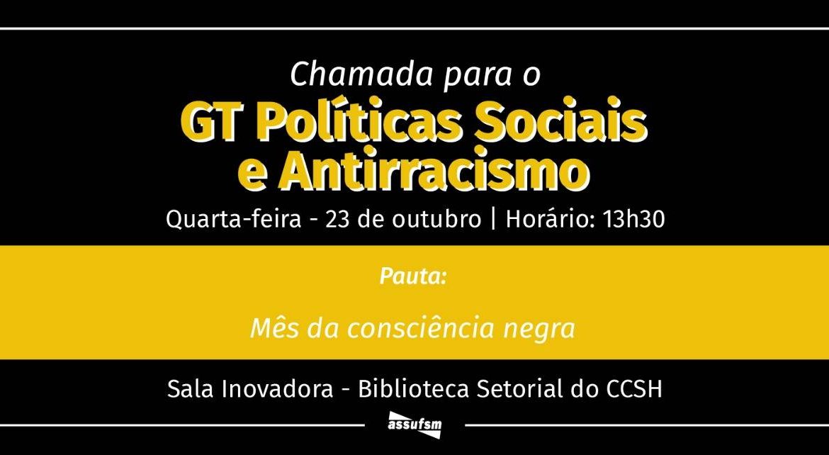 Na próxima quarta-feira, dia 23/10/2024, ocorrerá reunião do GT Políticas Sociais e Antirracismo da Assufsm, a partir da 13h30min.