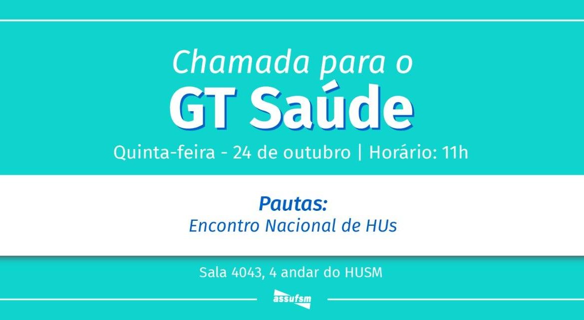 O GT Saúde se reúne na próxima quinta-feira, dia 24 de outubro, a partir das 11h. O local do encontro é no HUSM, 4o andar, sala 4043.