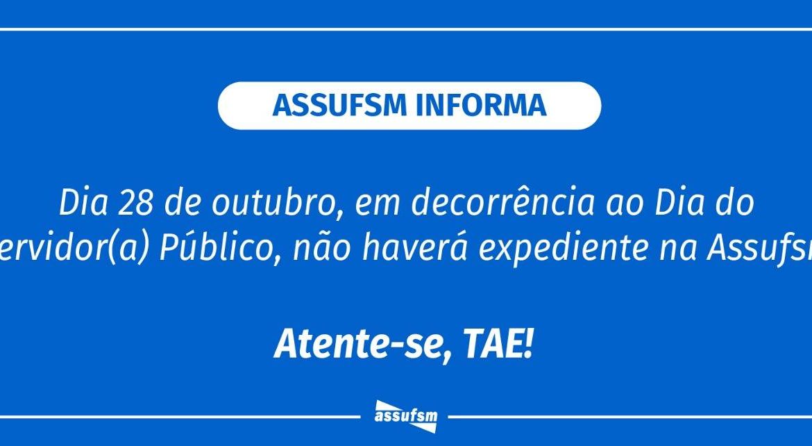 Devido ao feriado do Dia do e da Servidora Pública, a Assufsm informa que no dia 28 de outubro não terá expediente.