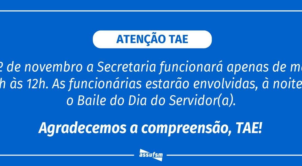 Devido ao Jantar Baile do Dia do Servidor(a) Público, dia 1º de novembro a Secretaria da Assufsm estará com funcionamento reduzido: das 7h às 12h.