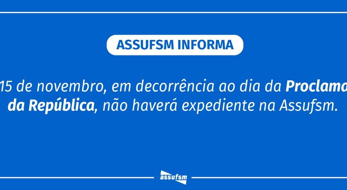 TAE, atenção. No dia 15 de novembro, a Assufsm não terá expediente devido ao feriado de Proclamação da República, conforme calendário acadêmico estabelecido pela UFSM.