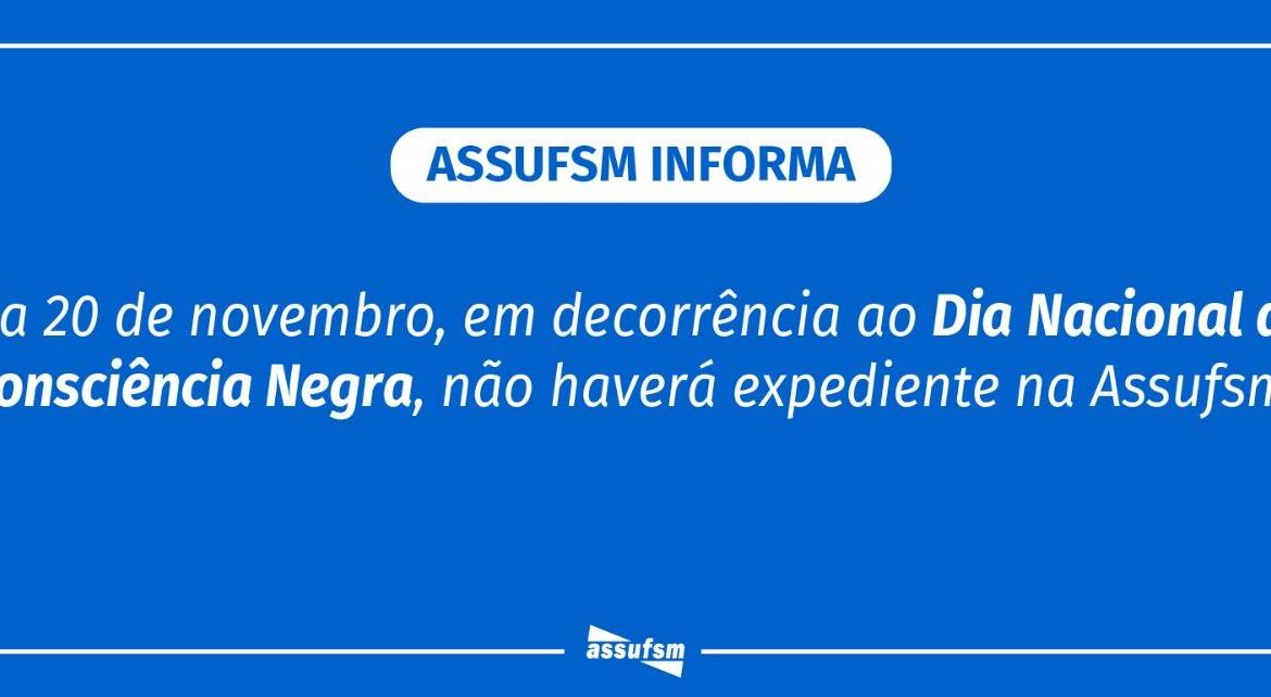 TAE, atenção. No dia 20 de novembro, a Assufsm não terá expediente devido ao feriado da Consciência Negra, conforme calendário acadêmico estabelecido pela UFSM.