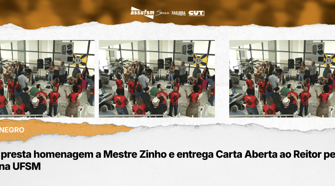 Em uma tarde de muita emoção e homenagens a Assufsm registrou, dentro da sua programação do Novembro Negro, uma celebração especial ao Mestre Zinho, sambista negro reconhecido no Rio Grande do Sul. As homenagens a Waldomiro Messias, seu nome oficial, ocoreram hoje, dia 19 de novembro, no hall da Reitoria da UFSM. Ele merece todas as homenagens por ter sido um artista múltiplo e um cidadão.