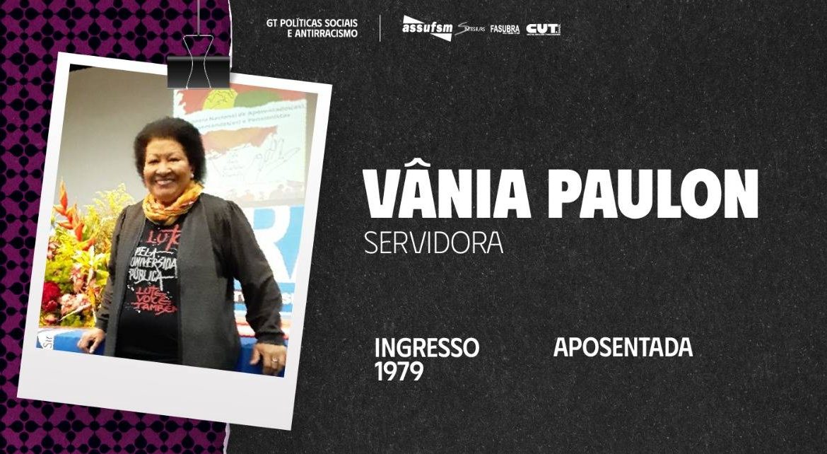 Além da programação e da Feijoada que a Assufsm está promovendo para o novembro negro, o GT Políticas Sociais e Antirracistas também irá homenagear algumas personalidades negras da UFSM que estavam e estão na militância. Na sequência, vamos homenagear a TAE Aposentada Vânia Paulon.