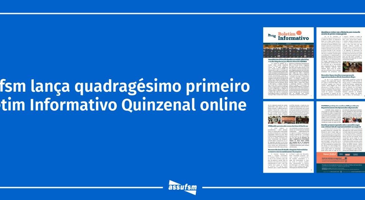 A Coordenação da Assufsm, gestão 2023-2025, em parceria com o Setor de Comunicação do Sindicato, lança a Edição de número 41 do Boletim Informativo Online.