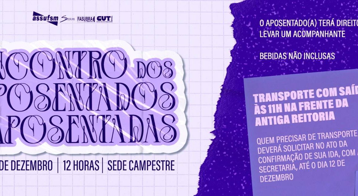O encontro, já aprovado em reunião de coordenação, será um almoço no dia 15 de dezembro, na Sede Campestre da Assufsm, às 12h. O aposentado e aposentada que desejar ir precisa se inscrever previamente na secretaria do sindicato ATÉ O DIA 12 DE DEZEMBRO através dos telefones (55)9.9105-9965; (55)9.9686-0049; (55)3220-8123 e (55)3220-8385, ou pelo e-mail secretaria@assufsm.com. Além disso, no momento da inscrição, o filiado(a) deve dizer se necessita de transporte para chegar até a sede, também até o dia 12 DE DEZEMBRO e tem direito a levar um/uma acompanhante. O transporte vai sair da frente da Antiga Reitoria, às 11h. O almoço ficará por conta da Assufsm, já as bebidas ficam a cargo do aposentado(a) e seu/sua acompanhante.