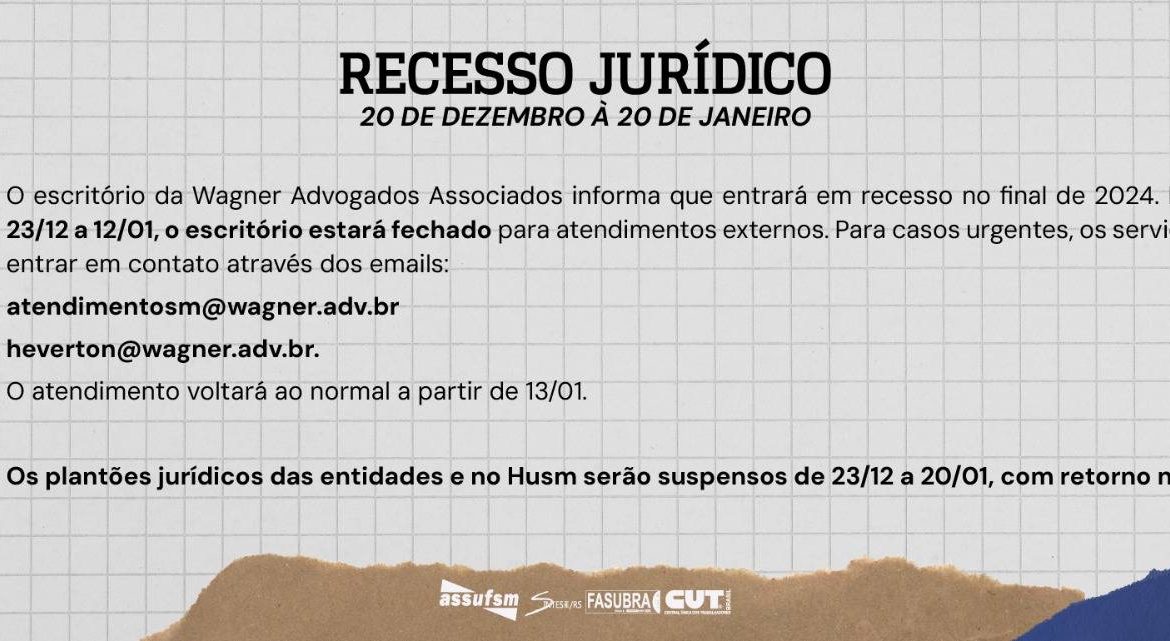 O escritório da Wagner Advogados Associados informa que entrará em recesso no final de 2024. Entre os dias 23/12/2024 a 12/01/2025, o escritório estará fechado para atendimento externo. O atendimento normal será dia 13/01/2025 Assim, neste breve período de recesso de final de ano, para aqueles clientes que necessitarem de alguma consulta jurídica ou retorno de urgência, os contatos poderão ser realizados através dos emails: atendimentosm@wagner.adv.br ou heverton@wagner.adv.br. Quanto aos plantões junto à Assufsm (incluso o HUSM), o período de recesso será maior, de  23/12/2024 à 20/01/2025. Os plantões presenciais no sindicato retornam no dia 21/01/2025. Os contatos para agendamento, são aqueles já conhecidos por todos(as), e em destaque abaixo: · Fones: (55) 3026 3206 e (55) 98105 0063 · Chat: (61) 3226 6937 · E-mails: secretaria@wagner.adv.br / telefonia@wagner.adv.br