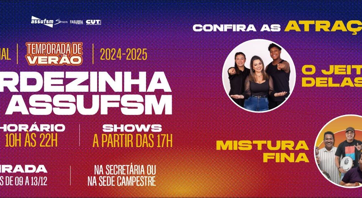 Reforçamos que o evento é exclusivo para filiados(as) e dependentes. A retirada de convites, que são gratuitos, ocorrerá de 9 a 13 de dezembro, na secretaria da Assufsm ou na sede campestre no dia 14, mediante apresentação da carteirinha ou documento de identidade para conferência do nome na lista.