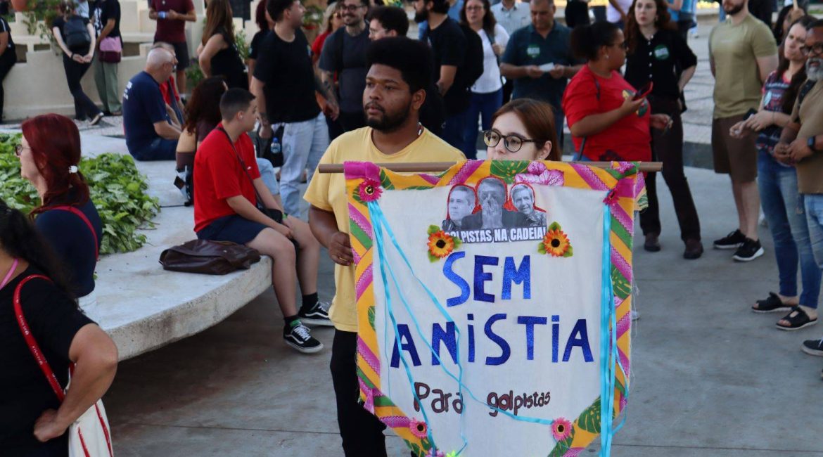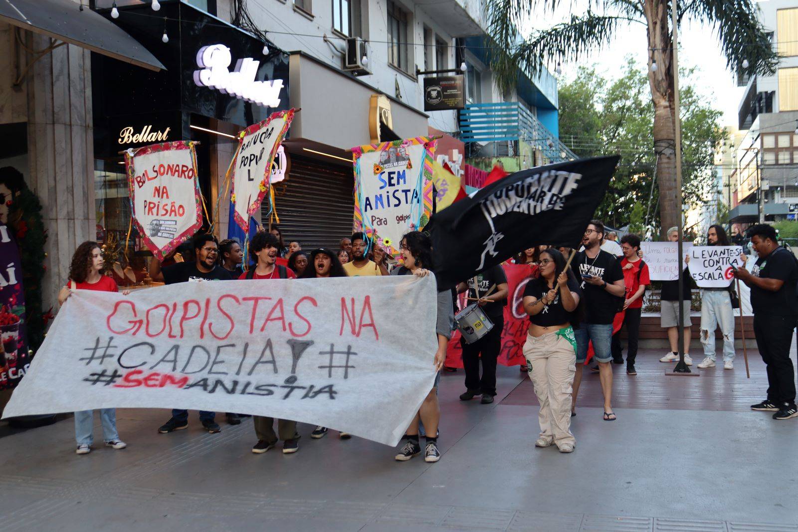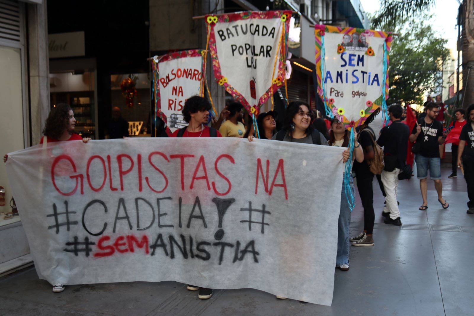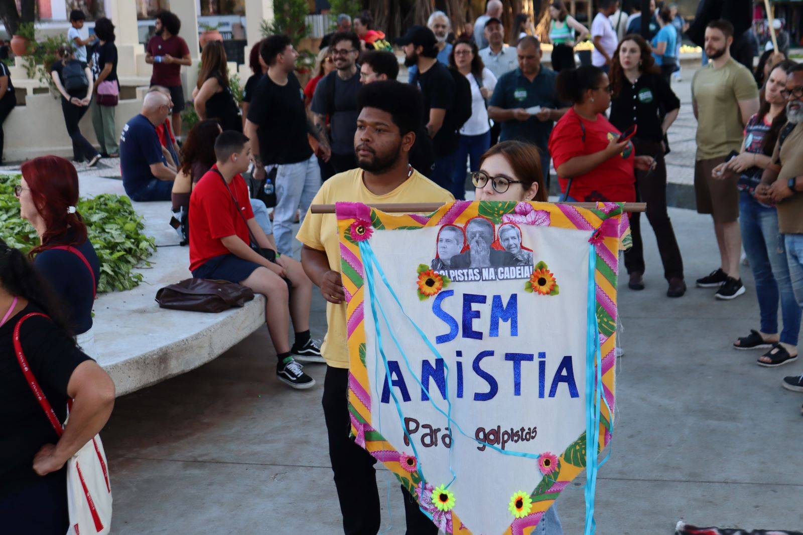 A manifestação, entoada por palavras de ordem como “Sem anistia e sem perdão. Eu quero ver o Bolsonaro na prisão”, iniciou na praça praça Saldanha Marinho e seguiu em marcha pelo Calçadão até a praça Saturnino de Brito.