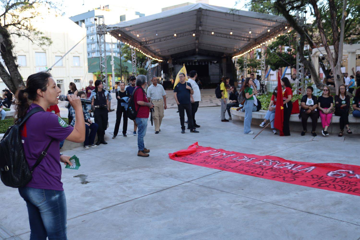 Na terça-feira (10), Dia Internacional dos Direitos Humanos, a Assufsm esteve representada – no centro de Santa Maria, juntamente de outros sindicatos, estudantes e movimentos sociais – em um Ato contra a anistia a golpistas que participaram da tentativa de golpe ocorrida no dia 8 de janeiro de 2023, em Brasília. Além do repúdio ao projeto de lei 1685/23 que prevê anistia aos golpistas, alguns cartazes manifestavam sentimentos de indignação e insatisfação sobre outras pautas que afetam diretamente a vida dos(as) trabalhadores(as), como a escala 6×1 e a não taxação de grandes fortunas.