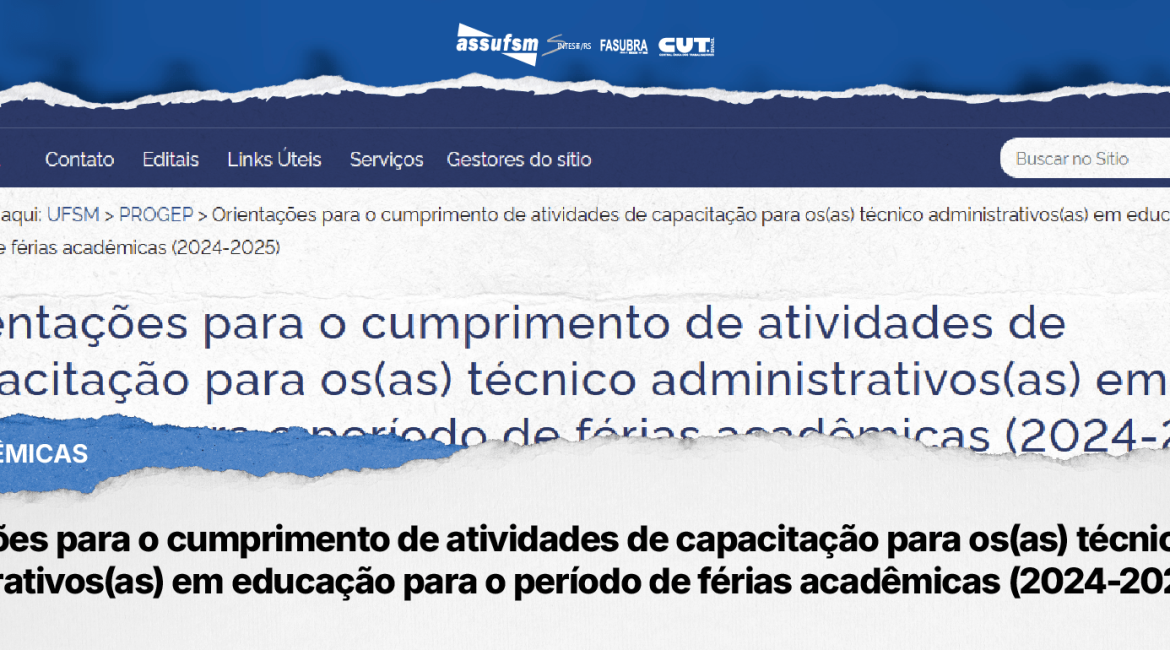 Considerando a Portaria Normativa UFSM N. 85/2024, de 22 de agosto de 2024, que estabelece orientações para o cumprimento de atividades de capacitação para os(as) técnico-administrativos(as) em educação para o período de férias acadêmicas, a Pró-Reitoria de Gestão de Pessoas informa que a relação de cursos de capacitação indicada para o período das férias acadêmicas entre dezembro de 2024 e março de 2025 está disponível no seguinte link https://www.ufsm.br/app/uploads/sites/341/2024/12/Relacao-de-capacitacoes-periodo-de-ferias-academicas-Dez-a-Mar-1.pdf