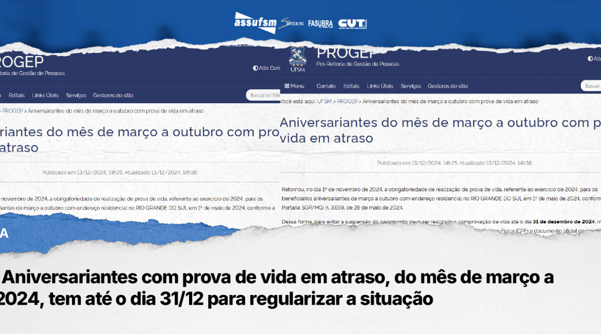 Retornou, no dia 1º de novembro de 2024, a obrigatoriedade de realização de prova de vida, referente ao exercício de 2024, para os beneficiários aniversariantes de março a outubro com endereço residencial no RIO GRANDE DO SUL em 1º de maio de 2024, conforme a Portaria SGP/MGI n. 3.659, de 28 de maio de 2024.