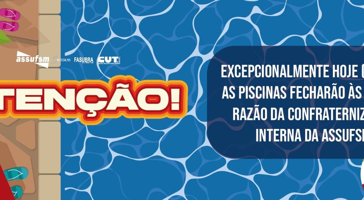 Atenção TAE, as piscinas da Sede Campestre fecharão mais cedo hoje (20), em razão da confraternização que a Coordenação realizará com os funcionários e funcionárias do sindicato, nessa noite.