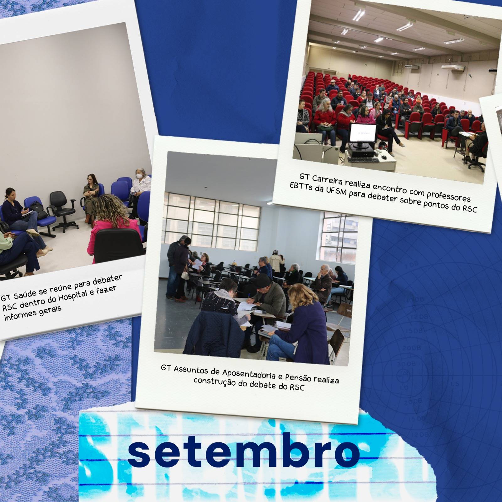 O GT Assuntos de Aposentadoria e Pensão da Assufsm, único no Brasil em atividade constante e mensal, também realizou ações que pudessem contribuir na construção do debate de interesse dos aposentados, aposentadas e pensionistas. O GT Vigilantes também teve seus debates para realizar a escolha da delegação que foi participar do seminário de segurança pública, na UFPE, em Pernambuco, em outubro. O GT Saúde encaminhou uma delegação para participar do Encontro dos Hospitais Universitários (HU’s), em Brasília, no mês de novembro.