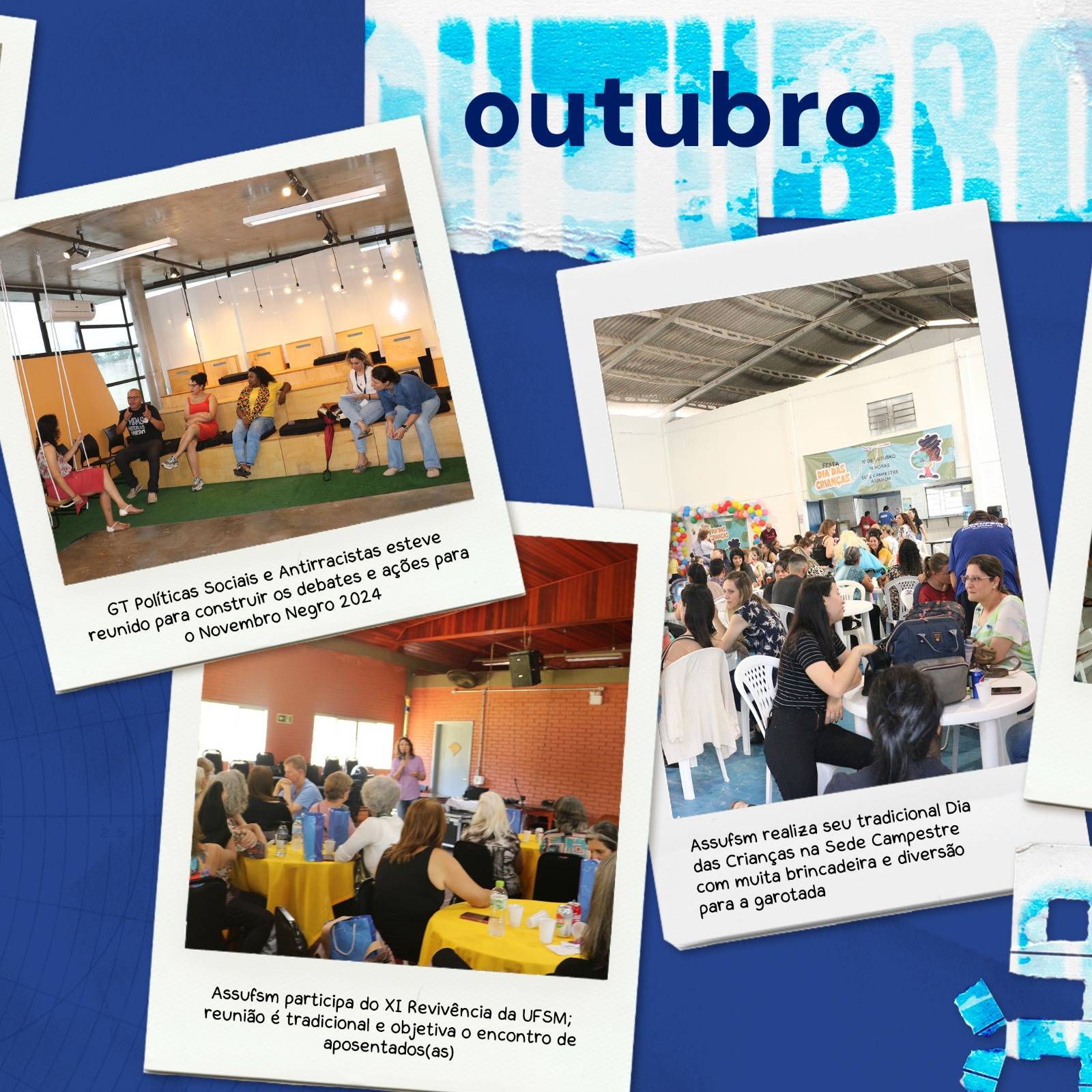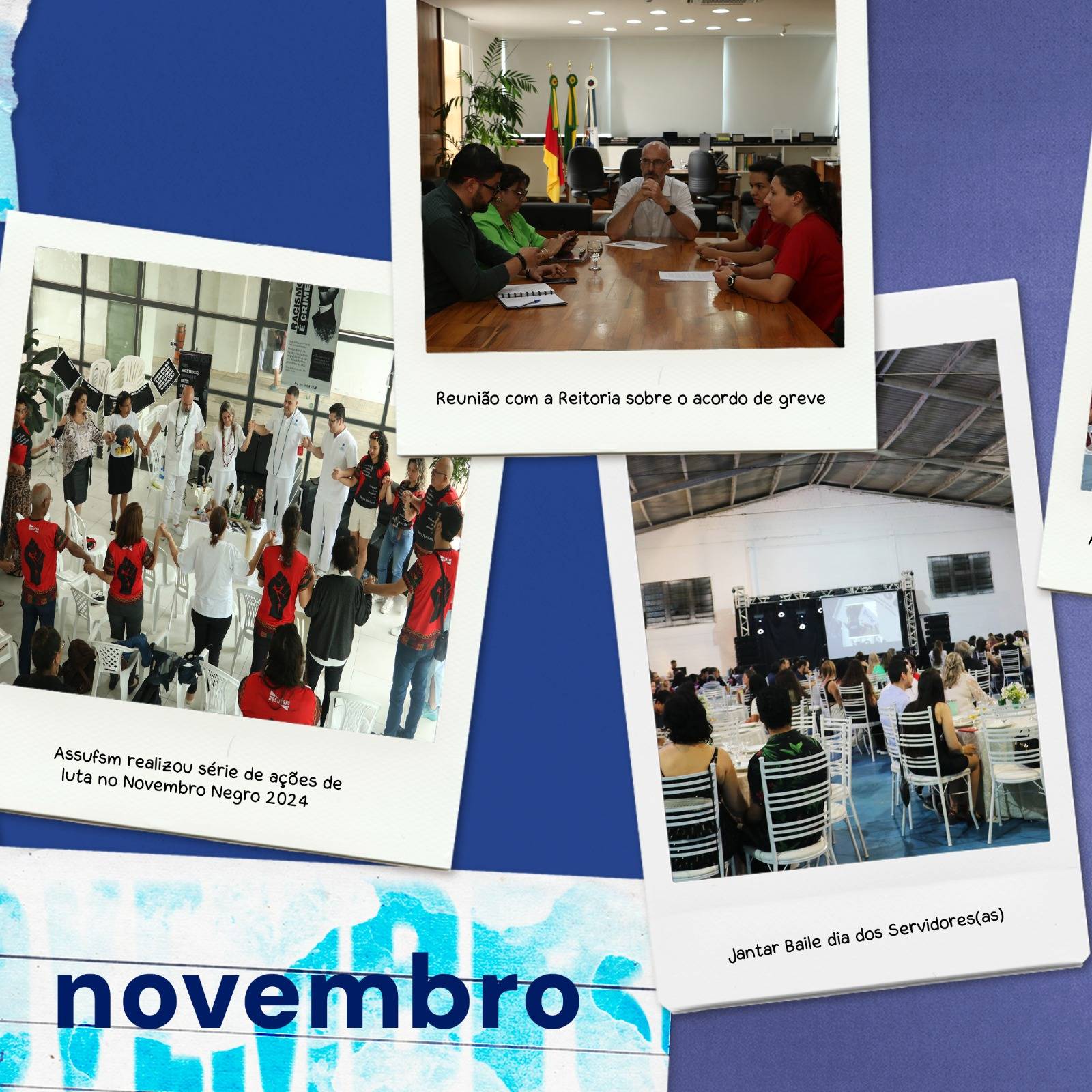 O GT Politicas Sociais e Antirracistas realizou seu encontro para debater ações para o novembro negro da Assufsm, onde desenvolveu uma exposição para mostrar quantos anos a UFSM não tem representantes negros e negras em cargos de alto escalão (veja aqui); um dia com uma vasta programação também foi realizada, com a tradicional feijoada e debate sobre relgiões de matriz africana no Hall da reitoria (veja aqui e aqui); além de homenagens à TAEs negros e negras que fizeram e fazem parte da história da UFSM e da Assufsm (veja aqui).
