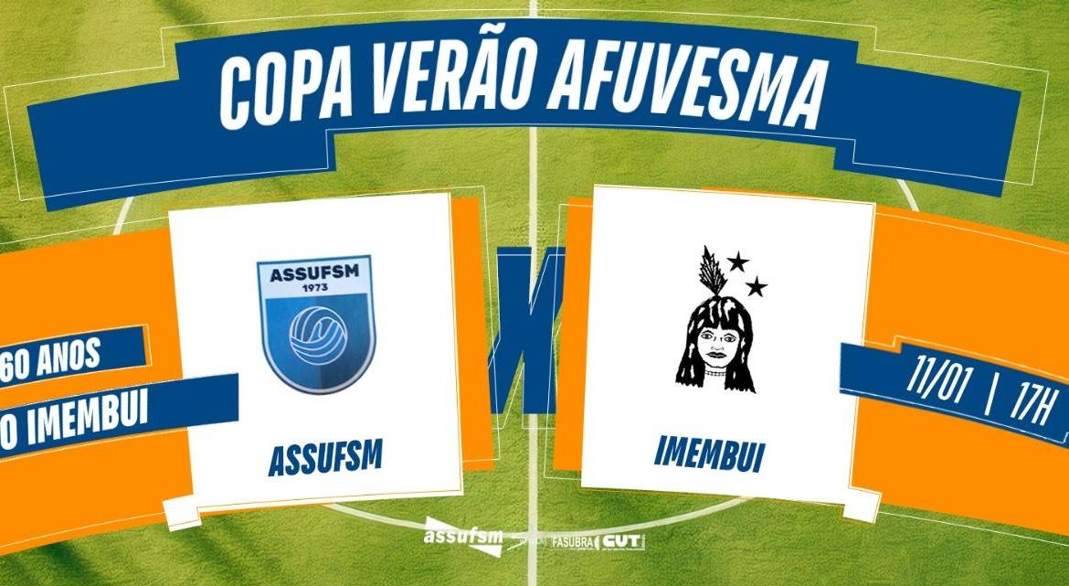 Copa Verão Afuvesma inicia no próximo sábado (11) Em GeralPostou 09/01/2025 Aos amantes do esporte: inicia no próximo sábado (11) a Copa de Verão Afuvesma! Na categoria 60 anos, Assufsm e Imembuy se enfrentam às 17h, no campo do Imembuí na Avenida Hélvio Basso. TAE, prestigie! #copaverão #afuvesma #assufsm