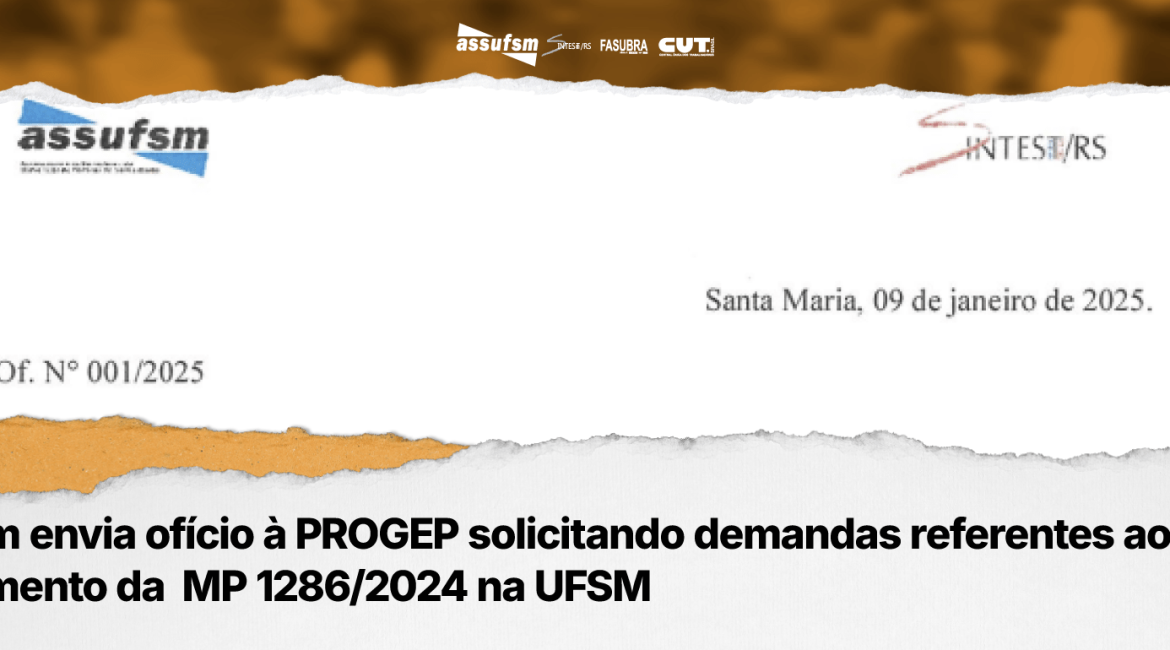 No dia 09 de janeiro, a Assufsm enviou à PROGEP o ofício de n° 001/25, solicitando demandas referentes à MP 1286/24 que já podem ser providenciadas pela gestão da UFSM sobre as portarias de progressão e de correção aos Incentivos de Qualificação (IQ).