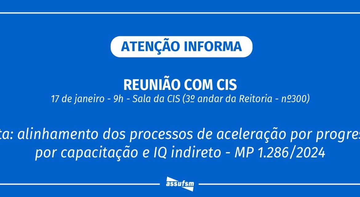 No dia 17 de janeiro, às 9h, a Coordenação da Assufsm terá reunião com a CIS da UFSM para o alinhamento dos processos de aceleração por progressão por capacitação e IQ indireto – MP 1.286/2024.
