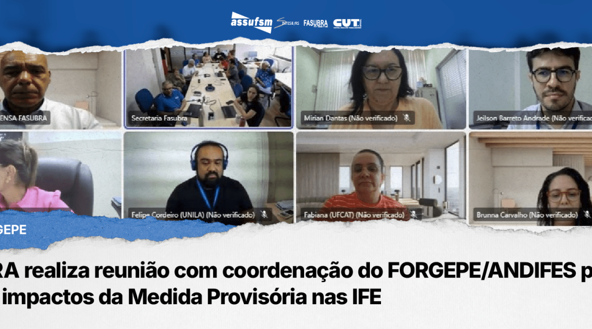 Na tarde desta sexta-feira(24), a FASUBRA Sindical participou de uma reunião com a coordenação do Fórum de Dirigentes de Gestão de Pessoas das Instituições Federais de Ensino (FORGEPE), vinculada à Associação Nacional dos Dirigentes das Instituições Federais de Ensino Superior (ANDIFES). O principal objetivo do encontro foi discutir os impactos da aplicação da Medida Provisória (MP) 1286/24 nas Instituições Federais de Ensino Superior (IFES) e compreender as dificuldades práticas que surgirão para viabilizar o pagamento dos efeitos da MP.