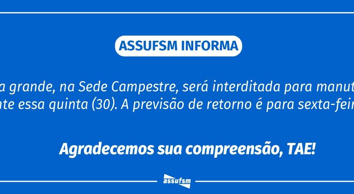 Devido a necessidade de realizar manutenção no motor-bomba da piscina grande, na Sede Campestre, a Assufsm informa que durante essa quinta-feira (30) a piscina grande estará interditada. O retorno normal deve acontecer durante a sexta-feira (31). O técnico responsável irá apenas hoje para realizar a manutenção dos filtros e bombas.