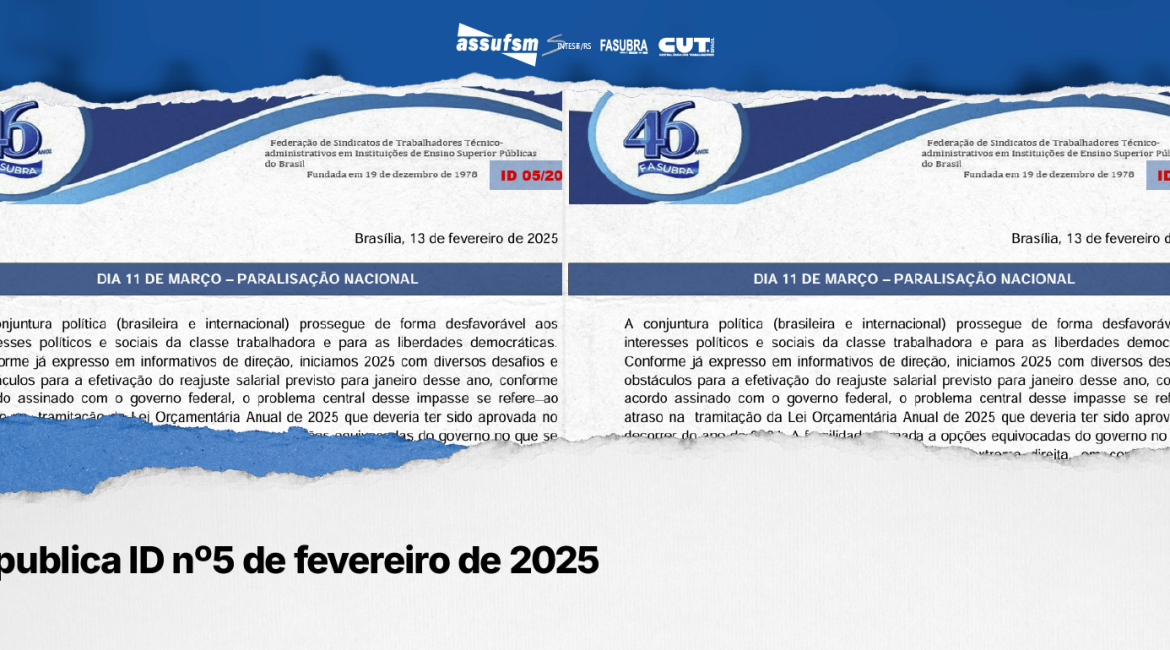 No ID 5 tem o resumo da reunião ordinária da Mesa Nacional de Negociação Permanente do SUS que ocorreu nos dias 11 e 12 de fevereiro; informes da reunião da Comissão Nacional de Supervisão da Carreira (CNSC) nos dias 5 e 6 de fevereiro; o chamado para paralisação das atividades no dia 11 de março, pós previsão de votação da Lei Orçamentária Anual (LOA), para 2025 e, conforme o um trecho do texto da FASUBRA: