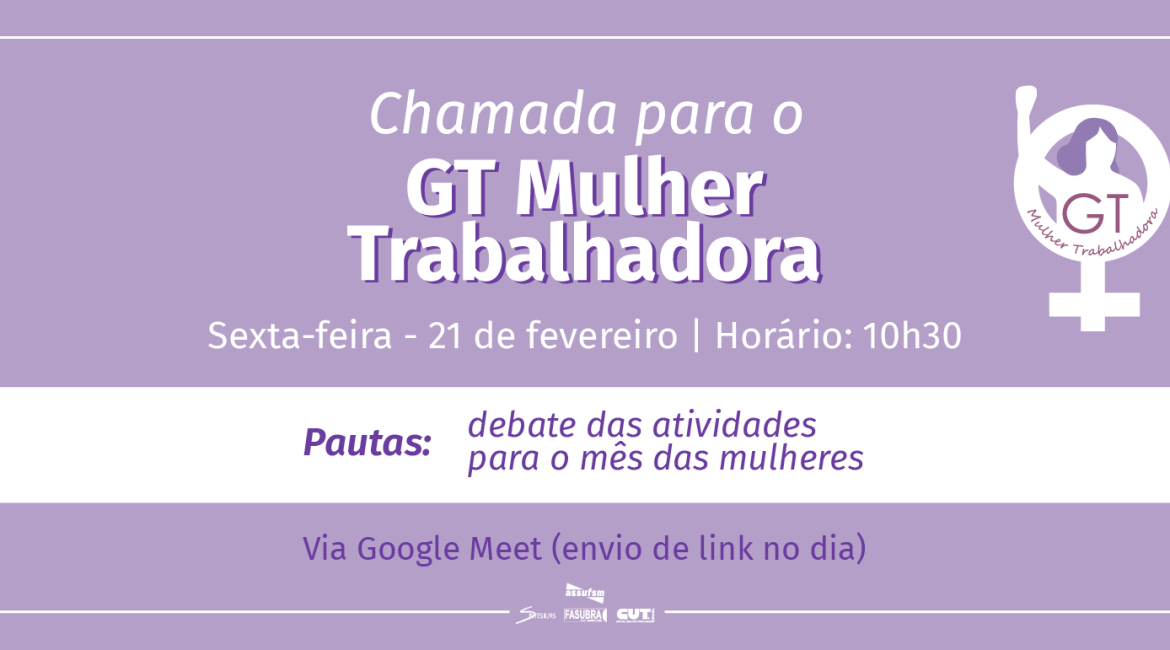 Na próxima sexta-feira (21), o GT Mulheres vai promover um debate sobre a organização de atividades para o mês da mulher. A reunião será às 10h30, de maneira online, via Google Meet (com envio de link no dia da reunião).