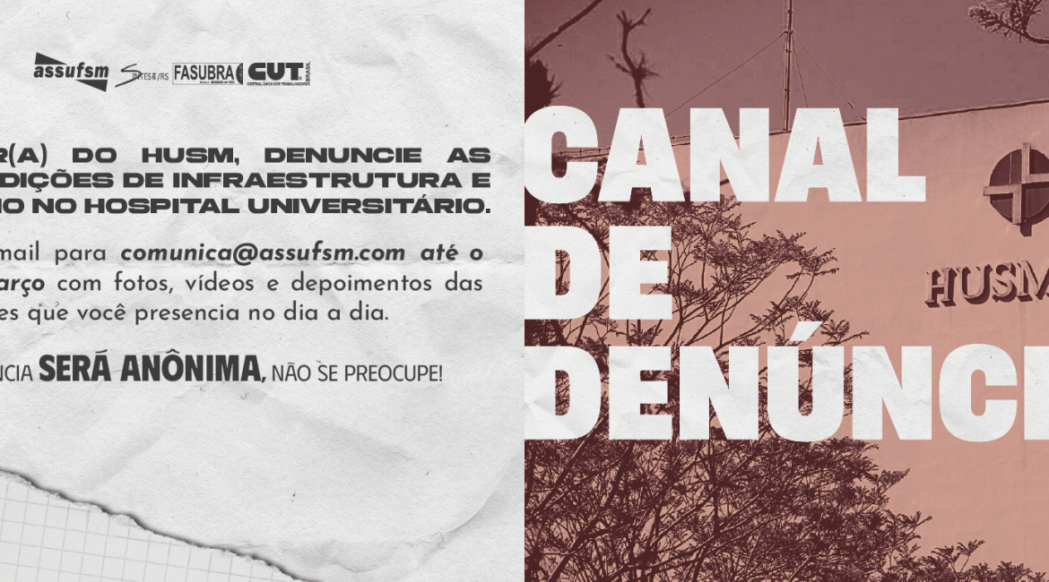 Servidor(a) do HUSM, denuncie já as más condições de trabalho e infraestrutura no Hospital Universitário! Envie um e-mail para comunica@assufsm.com com fotos, vídeos e depoimentos que comprovem a situação relatada.
