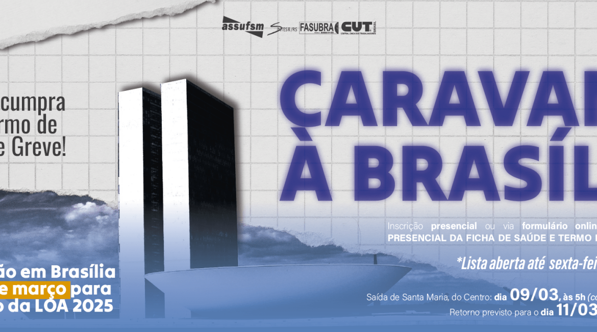 Então TAE, some-se a essa luta e participe se inscrevendo para a caravana. Para isso, atente-se às orientações a seguir: as inscrições podem ser feitas de maneira presencial na secretaria da Assufsm, na sala 217, ou via online por formulário Google (clique aqui e inscreva-se) até o dia 28 de fevereiro, às 11h. Se a inscrição for online, você precisará vir presencialmente preencher a ficha de saúde e termo de compromisso, também em nossa secretaria, que funciona das 7h às 14h (exceto no dia 28, que será até às 11h para se inscrever).