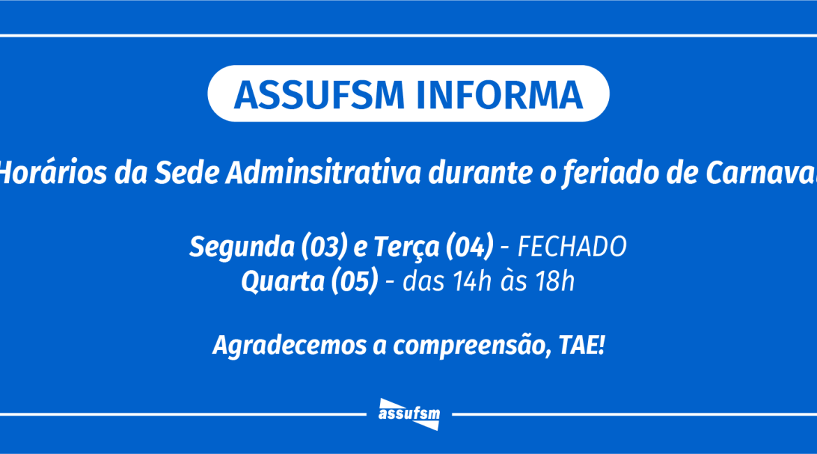 A Assufsm informa que nos dias 3 e 4 de março não terá expediente em sua sede administrativa, devido ao feriado de Canaval! No dia 5 de março, o sindicato atenderá das 14h às 18h, de maneira remota, com teletrabalho. Os contatos para atendimento são: (55) 9.9686-0049; ou e-mail secretaria@assufsm.com.