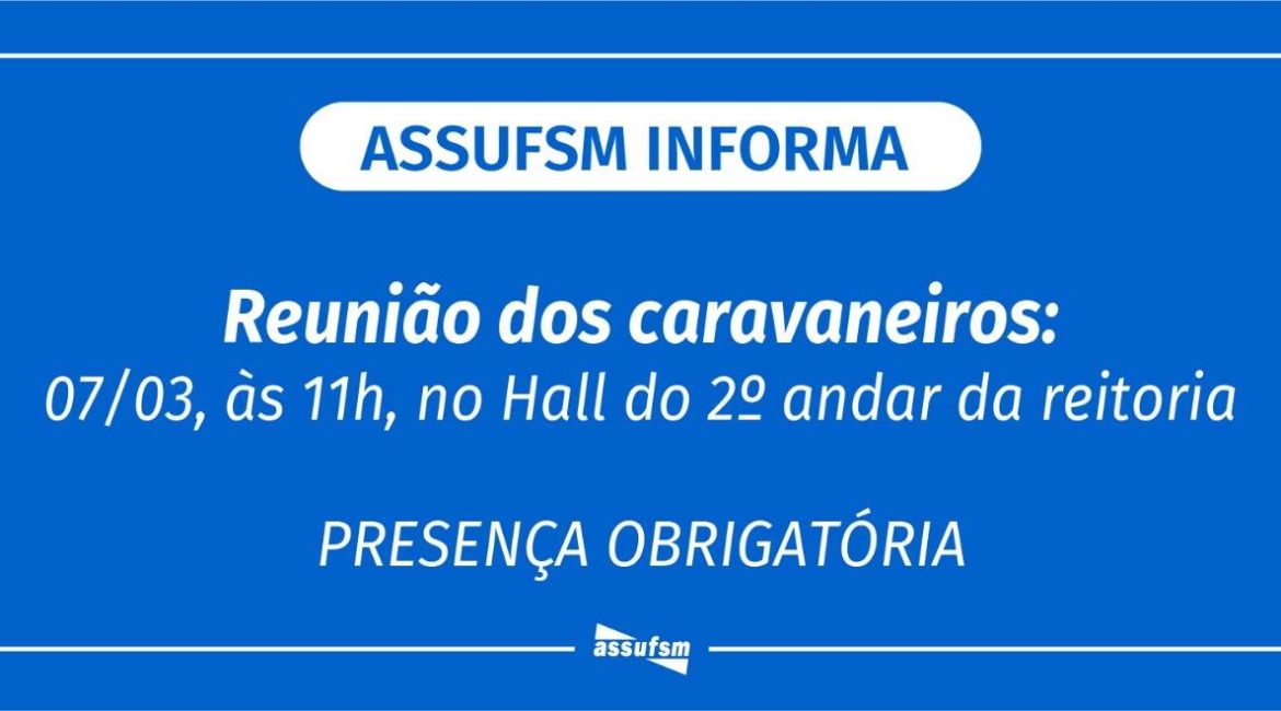 Nessa sexta-feira (07), às 11h, no Hall do Segundo Andar do Prédio da Reitoria, os caravaneiros(as) que vão embarcar à Brasília no final de semana devem, obrigatoriamente, comparecer na reunião para receberem orientações e assinar a documentação necessária.