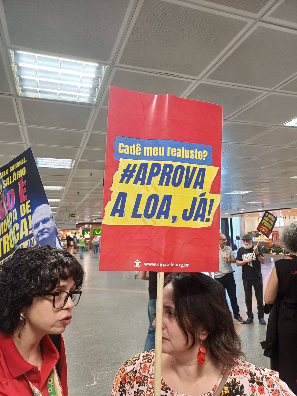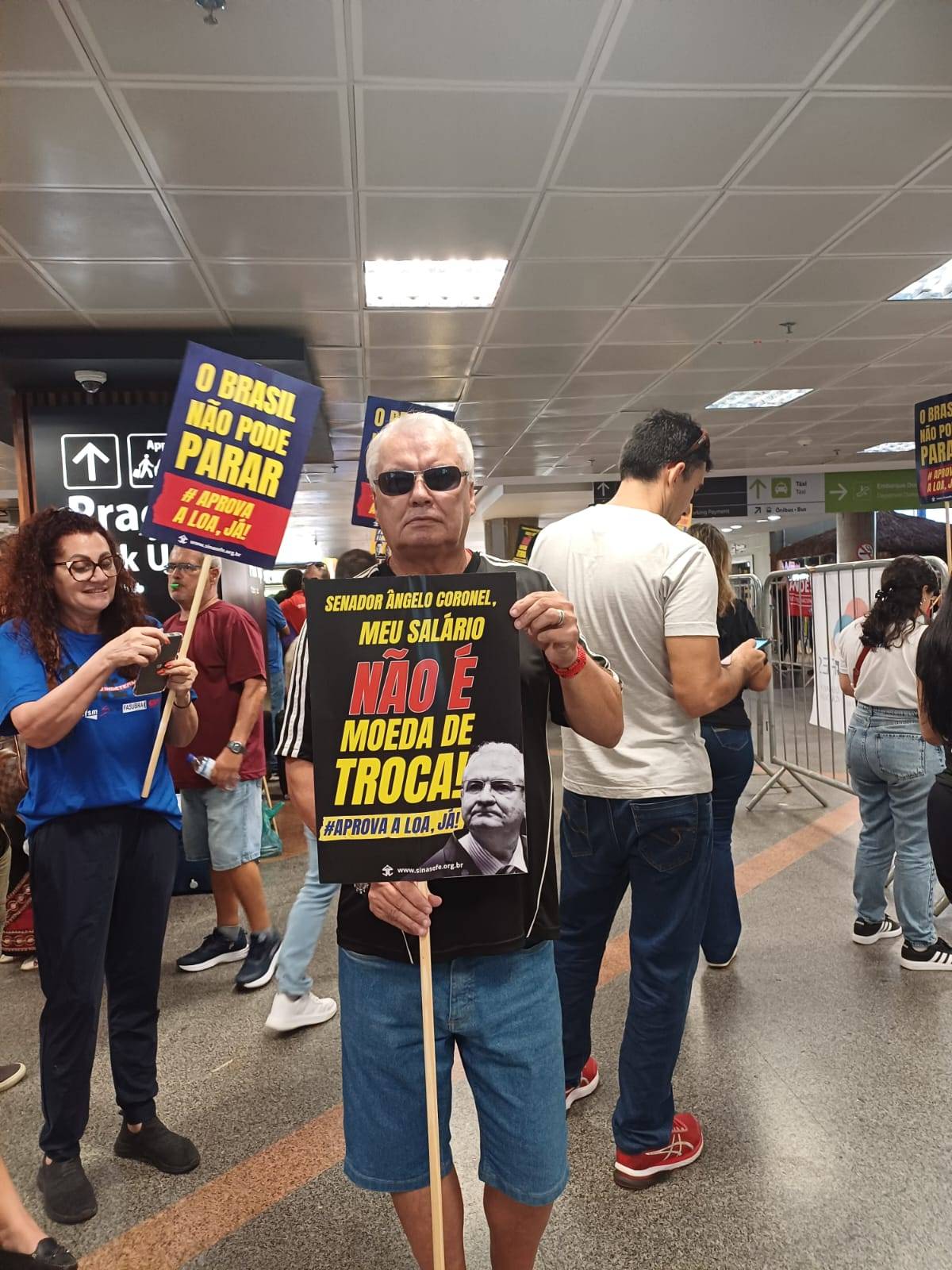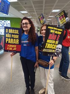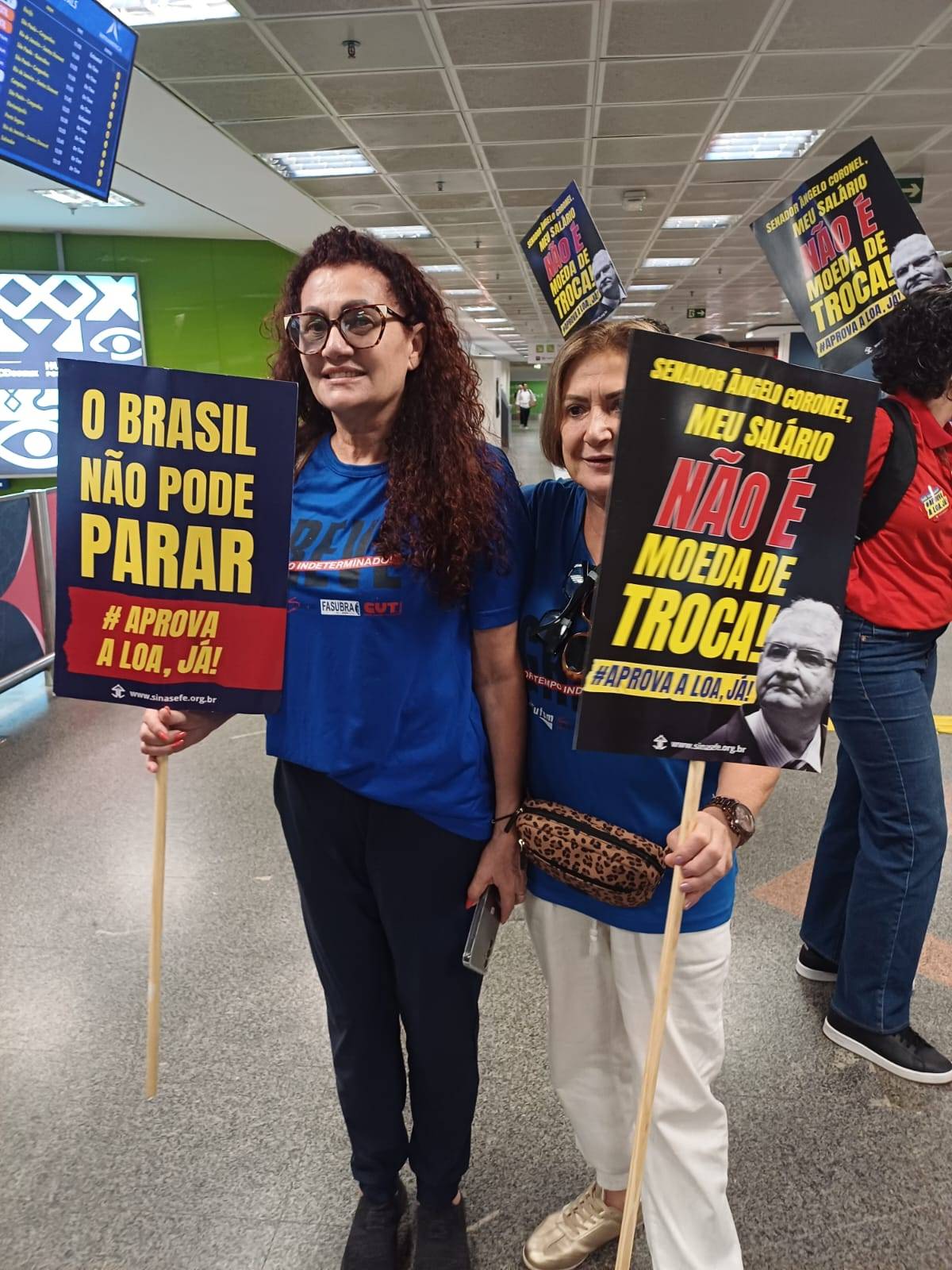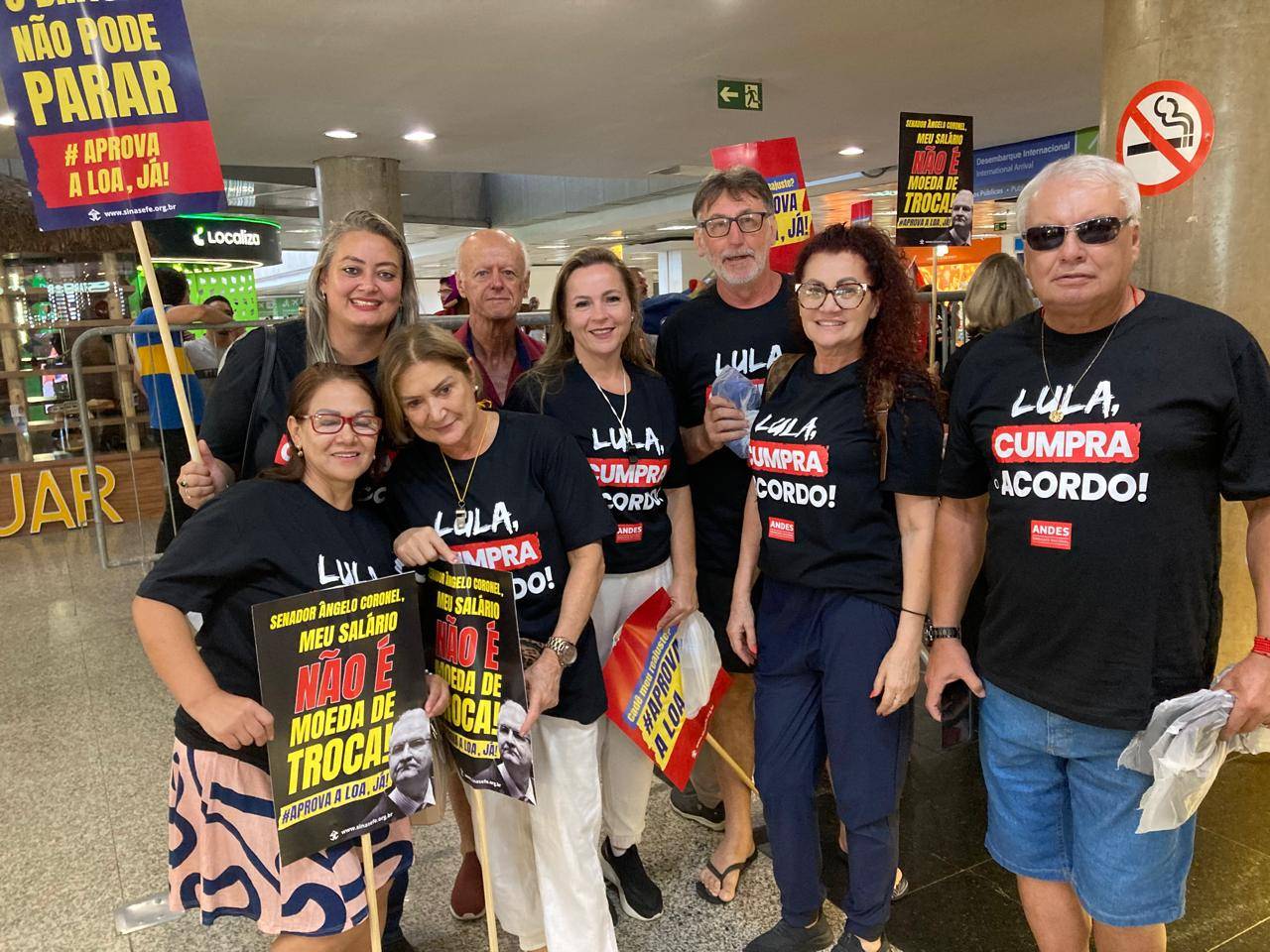 Nesta manhã do Dia Nacional de Paralisação – chamado pela Fasubra e aprovado em Assembleia da categoria, no dia 25 de fevereiro – servidores estiveram no aeroporto da capital federal recepcionando parlamentares com faixas e cartazes com os seguintes dizeres: “Cadê meu reajuste? Aprova a LOA, já!” , “Meu salário não é moeda de troca!”, e “O Brasil não pode parar.”