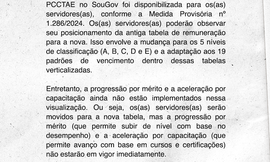 Entretanto, a progressão por mérito e a aceleração por capacitação ainda não estão implementados nessa visualização. Ou seja, os(as) servidores(as) serão movidos para a nova tabela, mas a progressão por mérito (que permite subir de nível com base no desempenho) e a aceleração por capacitação (que permite avanço com base em cursos e certificações) não estarão em vigor imediatamente.