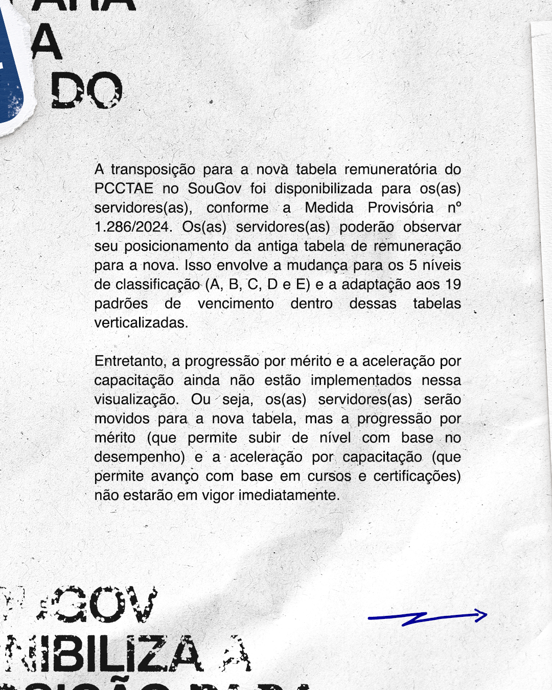 A transposição para a nova tabela remuneratória do PCCTAE no SouGov foi disponibilizada para os(as) servidores(as), conforme a Medida Provisória nº 1.286/2024. Os(as) servidores(as) poderão observar seu posicionamento da antiga tabela de remuneração para a nova. Isso envolve a mudança para os 5 níveis de classificação (A, B, C, D e E) e a adaptação aos 19 padrões de vencimento dentro dessas tabelas verticalizadas.