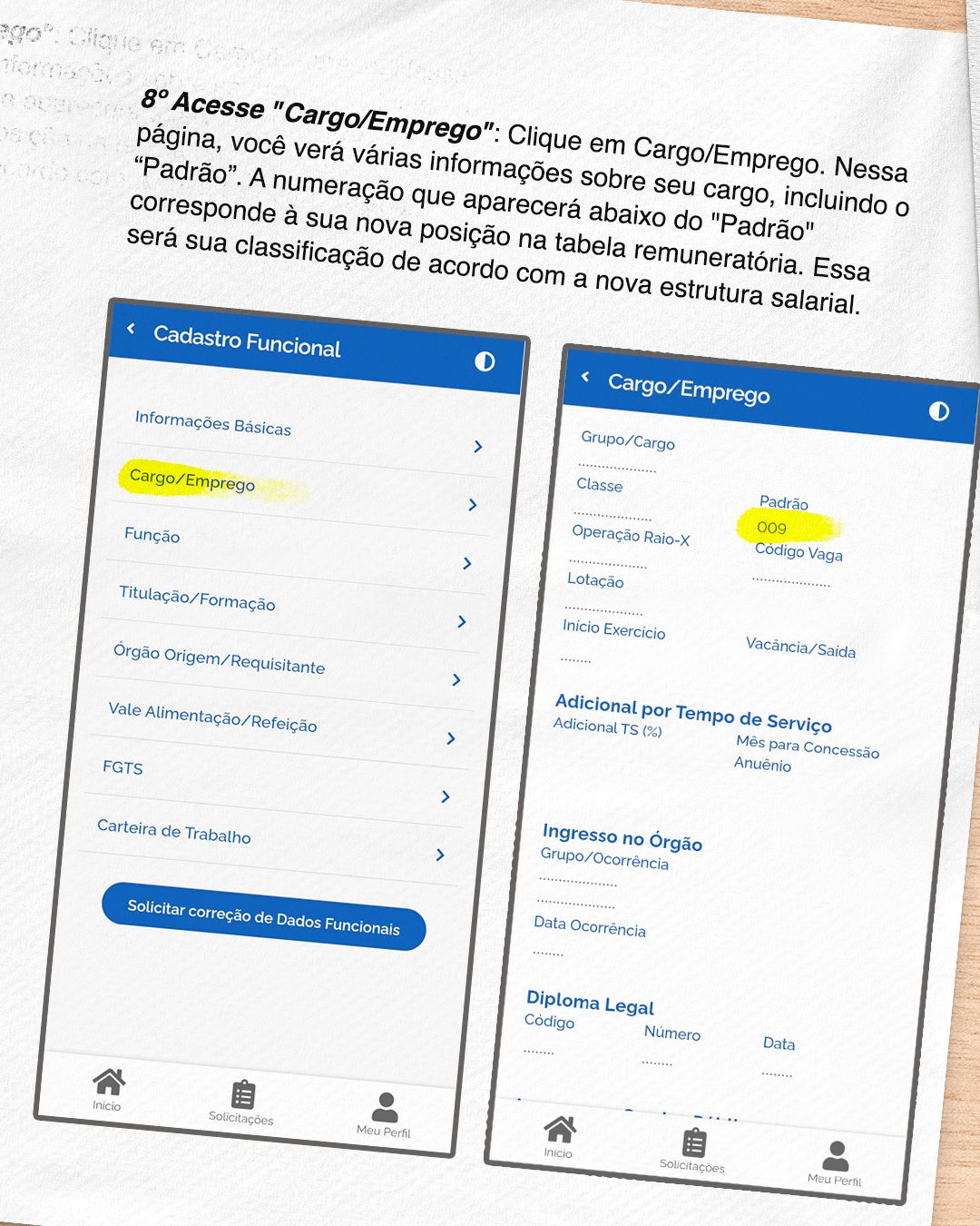 8º Acesse “Cargo/Emprego”: Clique em Cargo/Emprego. Nessa página, você verá várias informações sobre seu cargo, incluindo o “Padrão”. A numeração que aparecerá abaixo do “Padrão” corresponde à sua nova posição na tabela remuneratória. Essa será sua classificação de acordo com a nova estrutura salarial.