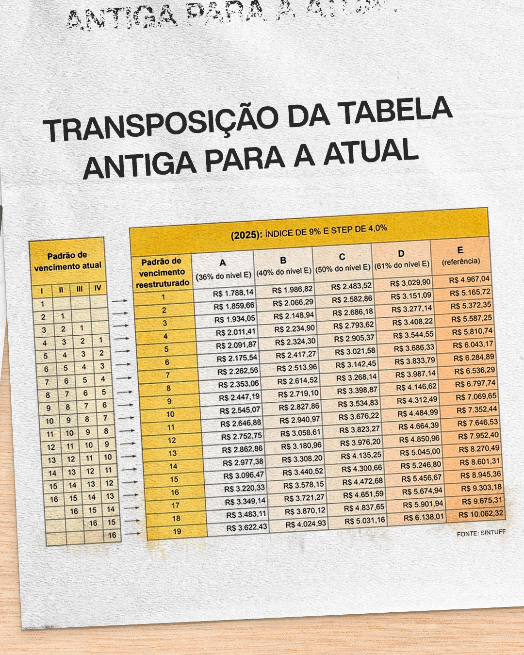 Confira a tabela da transposição para entender melhor como as mudanças serão aplicadas aos salários: