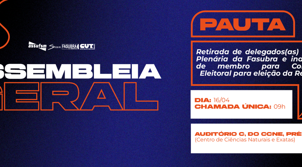 ⚠ A Assufsm convoca a categoria a participar da Assembleia Geral, a ser realizada na próxima quarta-feira (16), no auditório C do Centro de Ciências Naturais e Exatas, no prédio 18.
