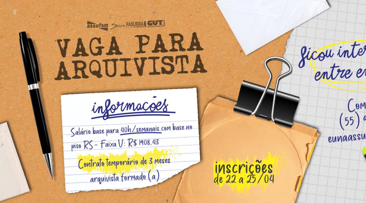 Atenção, a Assufsm está com uma vaga para arquivista formado(a) em aberto. As inscrições vão de 22 a 25 de abril, pelo email: eunaassufsm@gmail.com.